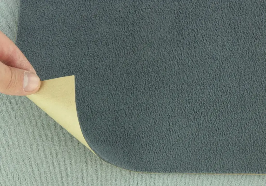 Клейова поверхня карпета покрита силіконізованим захисним папером, що запобігає його приклеєнню до непотрібних поверхонь до моменту використання. Клейова основа не впливає на еластичність карпета, завдяки чому він безперешкодно тягнеться разом із матеріалом, ідеально підходить для обтягування складних геометричних форм.
